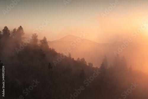 © Bashkatov, Fototapeta premium Mountain valley covered with majestic morning fog