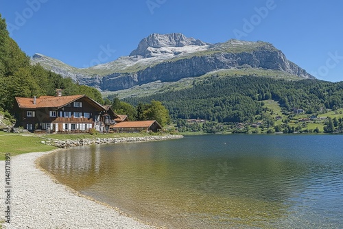© ArtSpree, Fototapeta premium Mountain valley during sunset. Natural summer mountain landscape. Forest and mountans. Mountain-image... Beautiful simple AI generated image