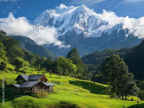 Fototapeta premium Mountain valley home with snow-capped peak