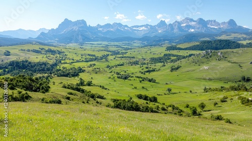 Obraz premium Mountain valley landscape, summer day, green fields, scenic view, travel...