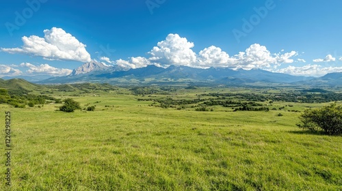 Fototapeta premium Mountain valley landscape, sunny day, green fields, scenic view, travel...