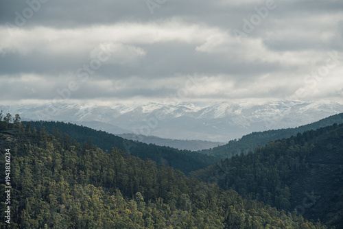 Obraz premium Mountain valley landscape with forest hills and snowy mountains