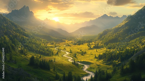 Obraz premium Mountain Valley Landscape with River Flowing Through Lush Green Meadow at Sunset