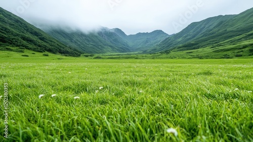 Fototapeta premium Mountain valley meadow, lush green grass, misty peaks, serene landscape,...
