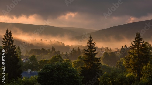 © ArtPixel-Portfolio, Fototapeta premium Mountain valley mist at sunrise, golden light illuminating a distant village and spruce trees