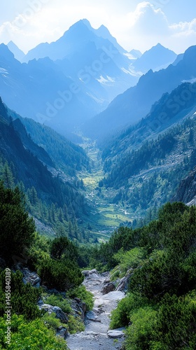 Fototapeta premium Mountain valley, misty peaks, lush greenery