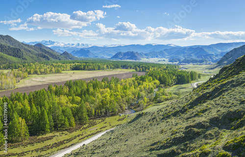 © Valerii, Naklejka premium Mountain valley on a spring sunny day, snow on the peaks and greenery