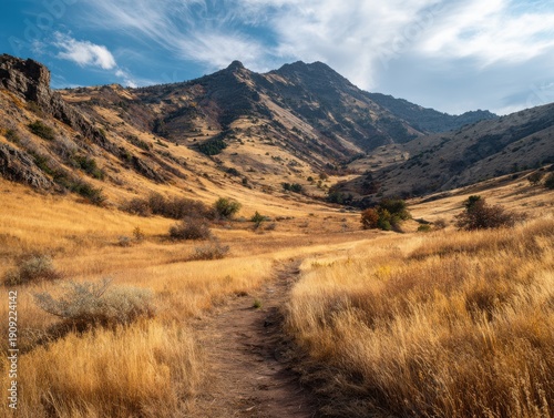 Fototapeta premium Mountain valley path golden dry grass blue sky trail