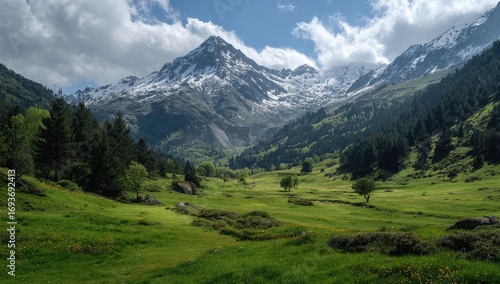 Fototapeta premium Mountain valley scene with lush greenery and snow-capped peak