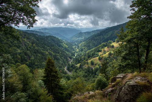 © Tohamina, Obraz premium Mountain valley scenic view lush green forest winding road cloudy sky