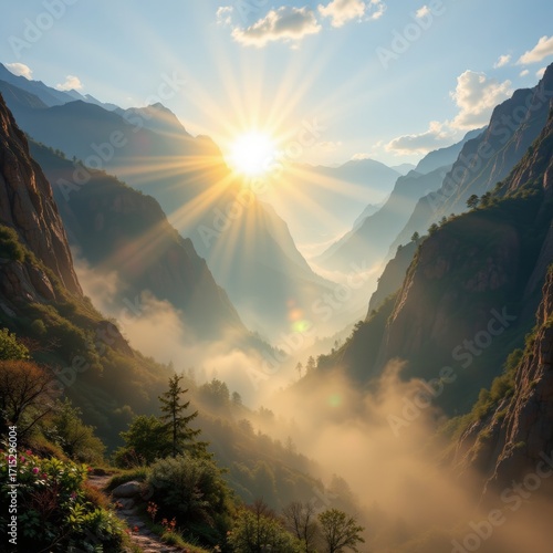 © sunflower24, Fototapeta premium Mountain Valley Sunrise with Fog