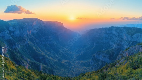 © Rudi, Fototapeta premium Mountain Valley Sunset View With Cityscape
