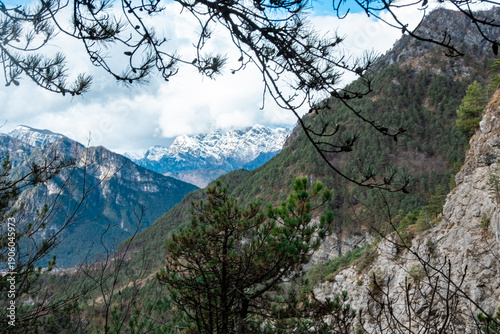 © Thomas, Obraz premium Mountain valley view framed by pine trees and rocky cliff under cloudy sky