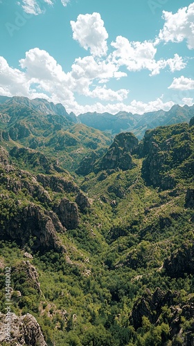 © Luis, Fototapeta premium Mountain valley vista, lush greenery, rocky peaks, sunny sky
