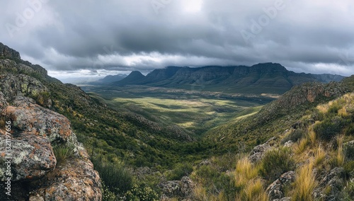 Naklejka premium Mountain valley vista under a dramatic sky