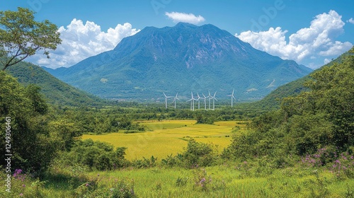 © MABRUR, Fototapeta premium Mountain valley wind farm scenic view