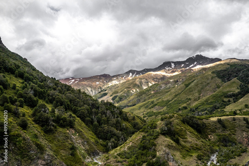 Fototapeta premium Mountain valley with colorful mountains on a cloudy day, Chile