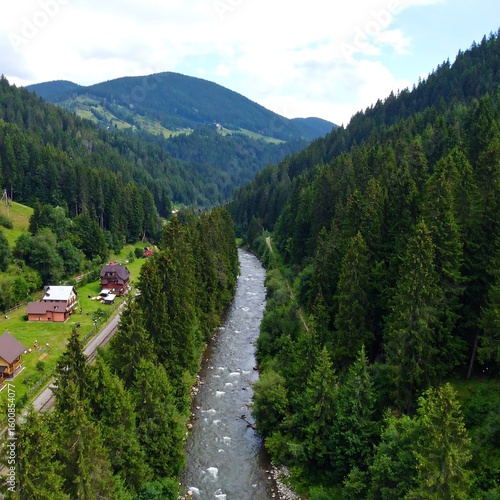 Obraz premium Mountain valley with river and houses