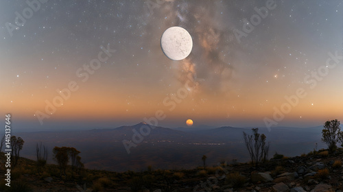 Obraz premium Mountain view at dusk with bright moon soft sky filled with stars City lights glow in the valley below horizon with
