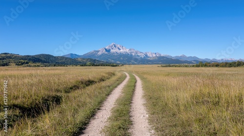 Fototapeta premium Mountain view, dirt road through field, clear sky, summer