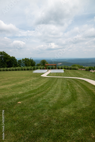 © Justice, Fototapeta premium Mountain View from Manicured Green Lawn Garden Estate Property