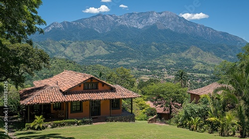 © novitasary, Obraz premium Mountain View House: Tranquil Escape in Lush Landscape