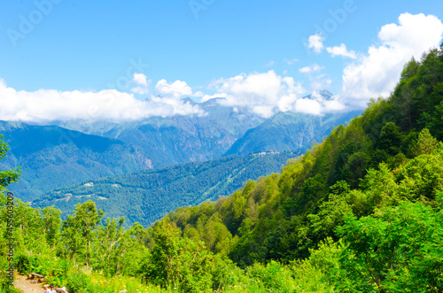 Fototapeta premium Mountain view in summer on a sunny day with clouds in the sky