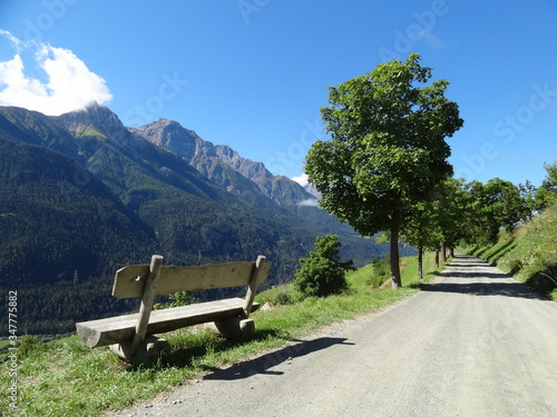 © Peter, Obraz premium Mountain view including bench in Switzerland