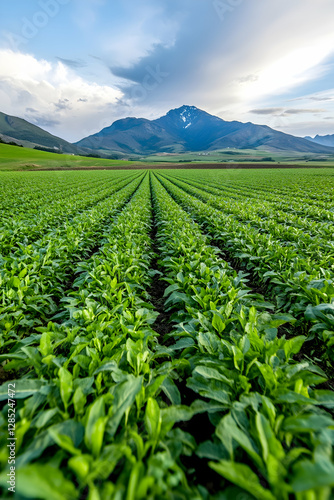 Fototapeta premium Mountain view over vibrant green farmland rows