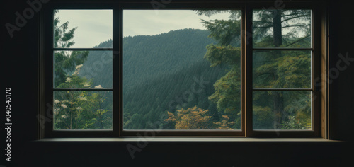 © sweet_mellow, Naklejka premium Mountain View Through Large Window In Modern Minimalistic Room. Green Forest Seen From Inside Quiet Place. Generative AI