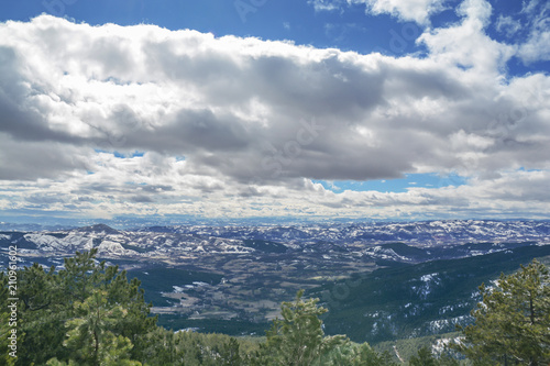 © bennian_1, Fototapeta premium Mountain view valley on snow winter day with cloudy dark and blue sky