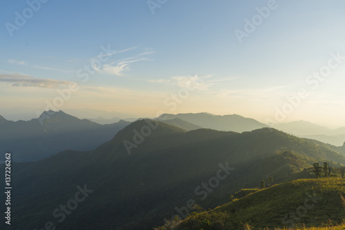 © StockGood, Obraz premium Mountain view with blue sky and clouds.