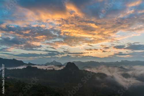 Fototapeta premium Mountain view with foggy environment during sunrise