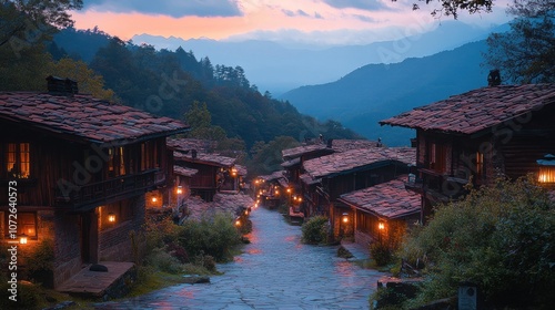 Naklejka premium Mountain Village at Dusk