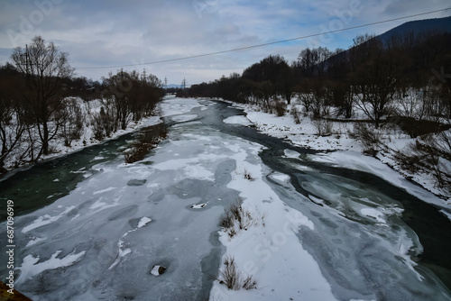 Fototapeta premium Mountain village in the Ukrainian Carpathians next to the river, winter...