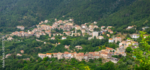 © VSzili, Obraz premium Mountain village nestled in green valley surrounded by forest