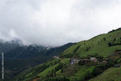 © Jasmien, Fototapeta premium Mountain Village on Green Hillside under Cloudy Sky in Sa Pa, Vietnam