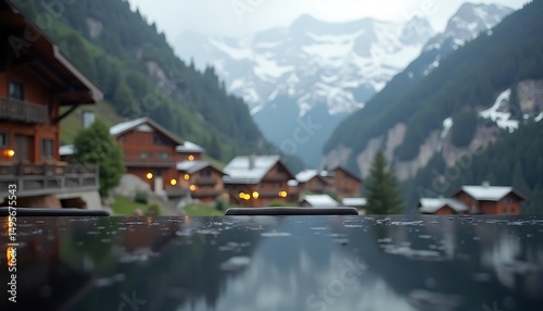 © IDEACENA, Fototapeta premium Mountain Village Reflecting in Water with Snowy Peaks