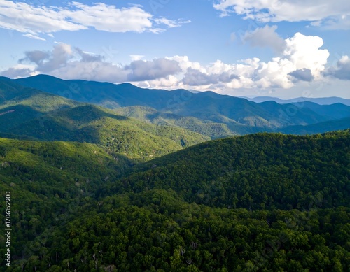 © volilah, Obraz premium Mountain vista, lush forests, dramatic sky