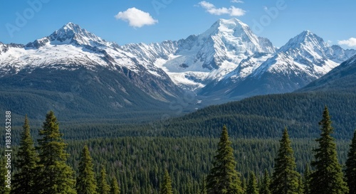 Fototapeta premium Mountain vista, snow-capped peak, lush forest