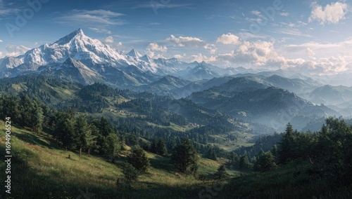 Obraz premium Mountain vista with snow-capped peaks, lush valleys, and forests