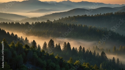 © Halim Karya Art, Fototapeta premium mountain wallpaper,Forest covered mountain range with haze at sunset