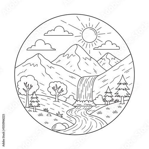 Fototapeta premium Mountain Waterfall Landscape Lineart Illustration