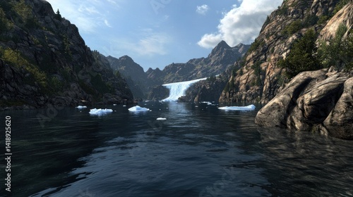 Fototapeta premium Mountain Waterfall over Glacial Lake