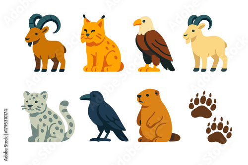 Fototapeta premium Mountain Wildlife Icons. Mountain Wildlife flat icons: ibex, lynx, eagle, mountain goat, snow leopard, raven, marmot, bear tracks.