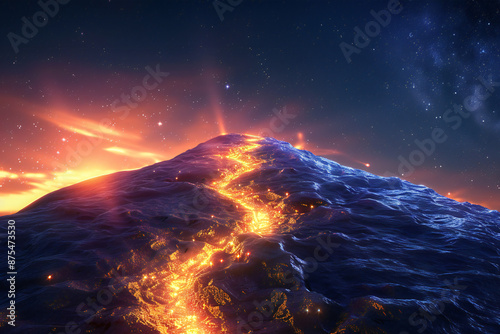 Naklejka premium Mountain with glowing lava at night, capturing nature's fiery beauty