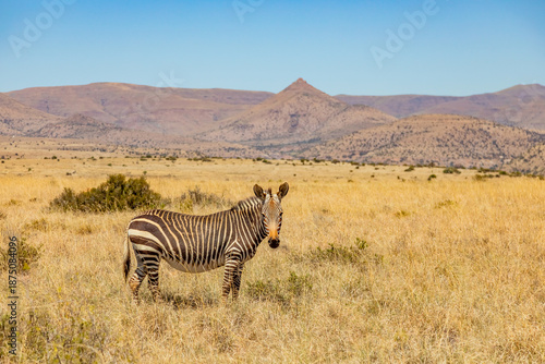Fototapeta premium Mountain Zebra grazing in grassland in Game Reserve
