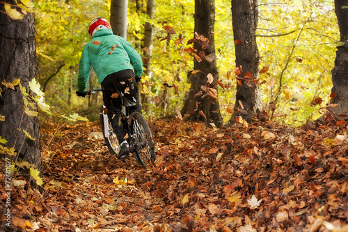 © KopoPhoto, Fototapeta premium Mountainbiker rides in autumn forest