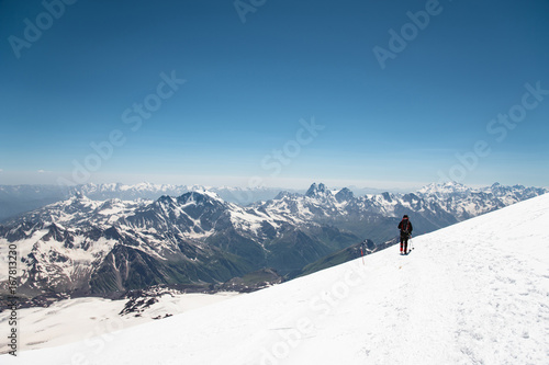 © yanik88, Obraz premium Mountaineer in the mountains strolls along the snow slope against the background of snow-capped peaks