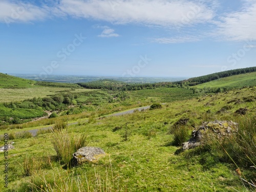 Obraz premium Mountainous Grassland with Trees Under a Cloudy Sky